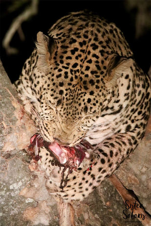 Upon turning the vehicle around, we found stomach contents on the road. So we followed the drag marks and found a male leopard in the tree with a kill that he had stolen from the four wild dogs, and just off to our left in a small bush was a female leopard who was watching the male as she was waiting to mate. We watched the pair for a while, and eventually, the male removed the carcass from the tree and relocated it, with the female following after him.